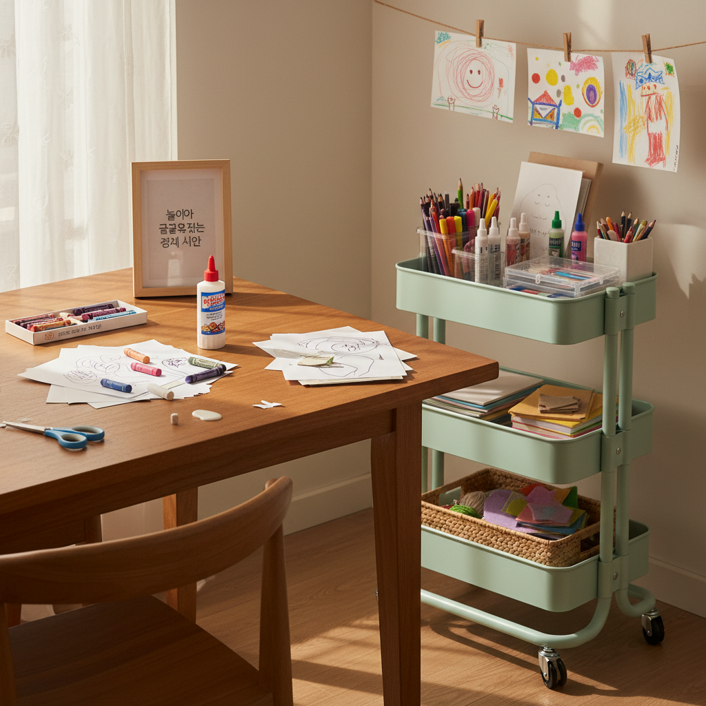 놀이 테이블 한쪽은 한 번 비워 두는 것보다 다음 활동용으로 남겨 둘 작은 시작 구역이 먼저 보이게 남겨 두는 편이 훨씬 오래 갔습니다. 만들기 재료를 종류보다 쓰임 기준으로 나누기, 진행 중 재료와 다 쓴 재료를 섞지 않기, 다음 활동도 바로 펼칠 수 있게 복귀시키기 같은 기준도 결국 이 자리가 무너지지 않을 때 자연스럽게 따라왔습니다.