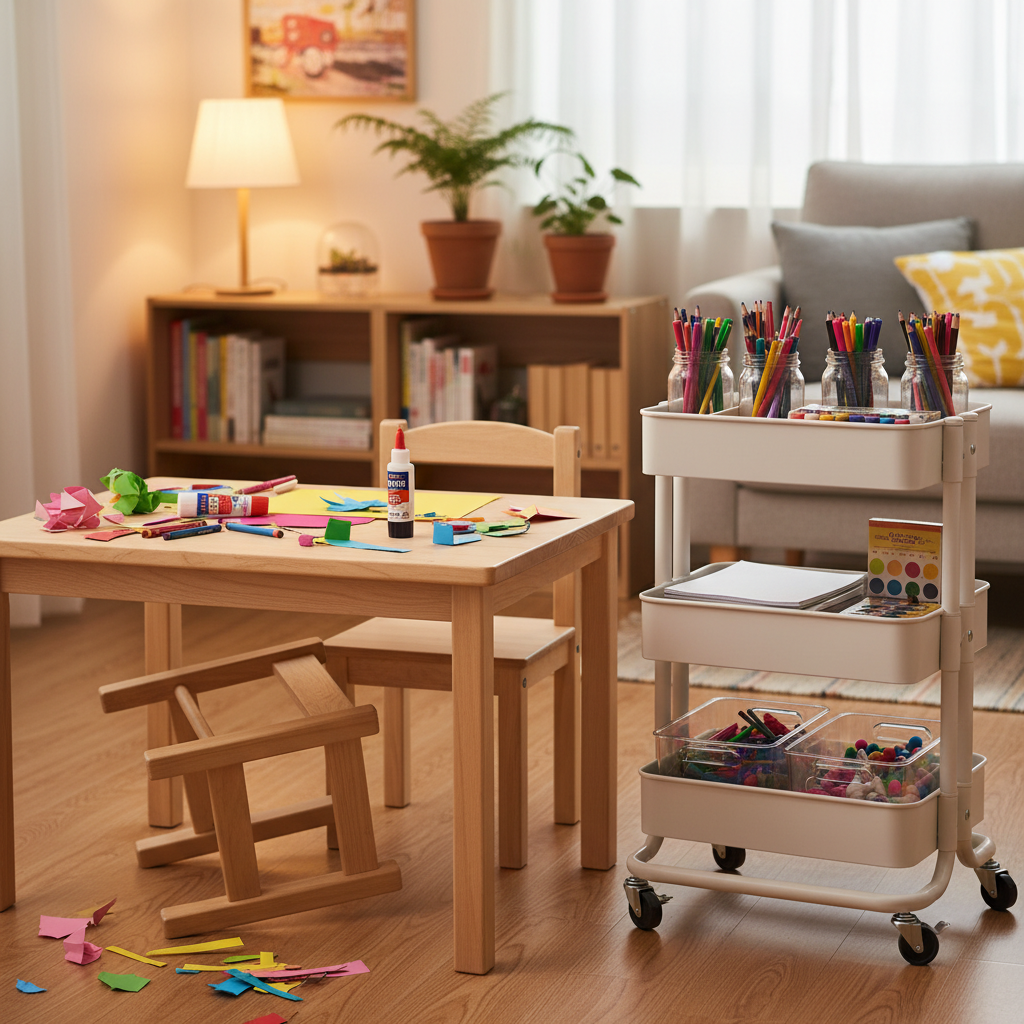 놀이 테이블 한쪽은 한 번 비워 두는 것보다 다음 활동용으로 남겨 둘 작은 시작 구역이 먼저 보이게 남겨 두는 편이 훨씬 오래 갔습니다. 만들기 재료를 종류보다 쓰임 기준으로 나누기, 진행 중 재료와 다 쓴 재료를 섞지 않기, 다음 활동도 바로 펼칠 수 있게 복귀시키기 같은 기준도 결국 이 자리가 무너지지 않을 때 자연스럽게 따라왔습니다.